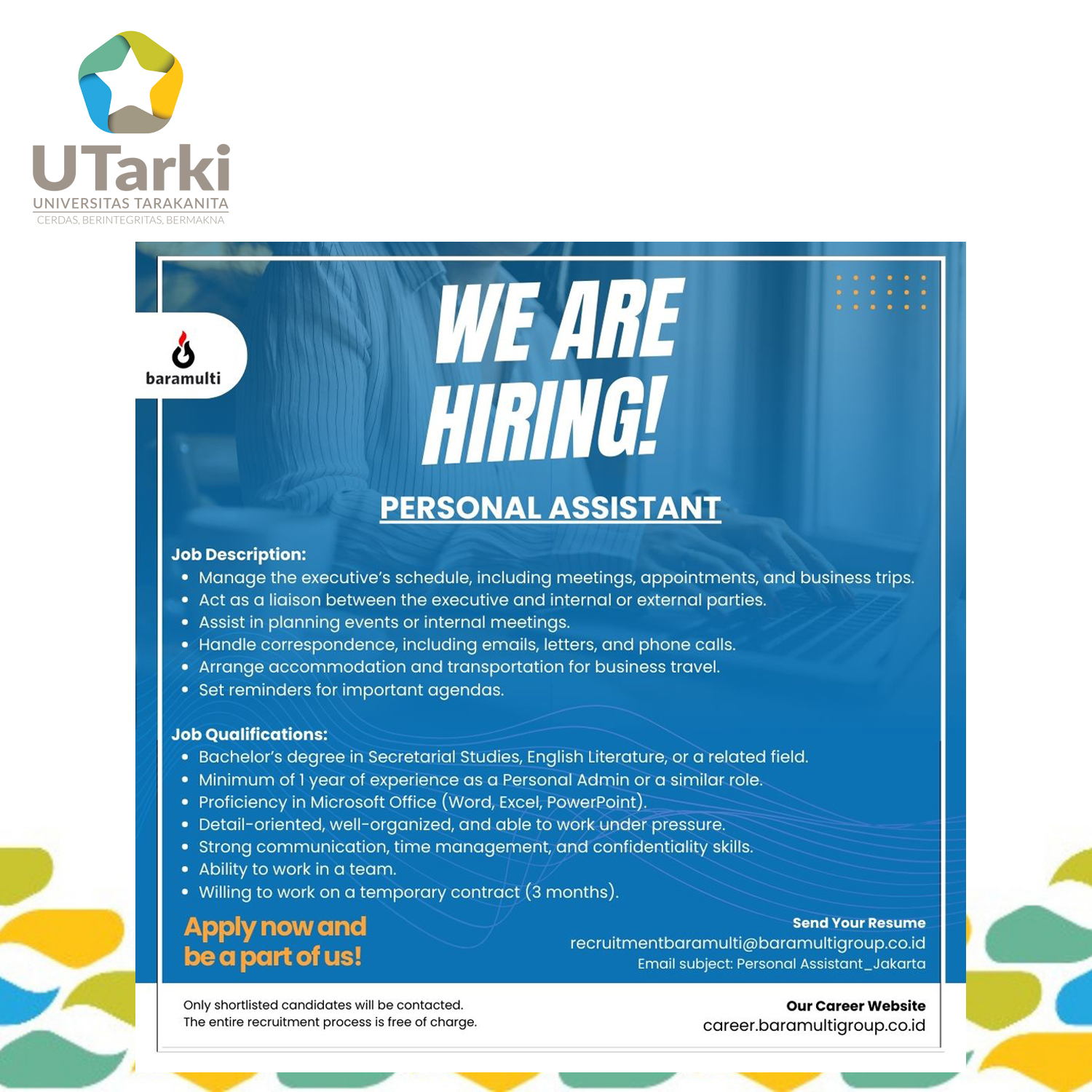 Baramulti Group membuka peluang bagi pribadi yang terorganisir, detail-oriented, dan komunikatif untuk bergabung sebagai Personal Assistant.