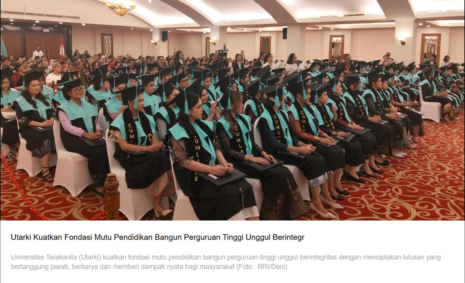 RRI.CO.ID, Jakarta : Universitas Tarakanita (Utarki) berkomitmen membangun pendidikan tinggi yang unggul, berintegritas dan relevan dengan kebutuhan masyarakat. Keberhasilan lulusan tidak hanya menjadi capaian akademik, tetapi juga awal dari tanggung jawab untuk memberi kontribusi nyata di tengah masyarakat.